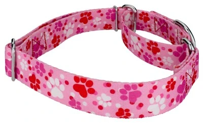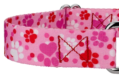 You’ll go mutts over Country Brook Petz’ Puppy Love Martingale Dog Collar! Adorable shades of pink, red, and white puppy paw prints are scattered on a pretty pink background. A fetching pattern of paws with hearts encapture pure perfection of puppy love! Printed using our colorfast dye, our collars will not run or bleed. Created from superior hardware and webbing, Country Brook Petz’ Puppy Love Martingale Dog Collars will not only provide your pup with a trendy collar, but will give you a sense of ease when using our products.Is your good boy or girl slipping out of their collar? Well, our martingale collars are designed to prevent your pup from pulling out of their collar by tightening around your dog’s neck whenever they try to remove their heads. Once Fido quits pulling, the collar relaxes against their neck. Perfect for training, the twin loop design gives you control over your stroll. The martingale collar is often referred to as a humane choke collar. A no-slip, adjustable-choke collar is an excellent solution for sighthounds who slip out of their collars.The Extra Small, Mini and Micro are still reliable with a 700 lb. tensile strength, even though they may seem delicate.By adjusting the metal slide, you give slack to the loop. Slip it over your dog’s neck and decrease size until you can comfortably slip only a couple of fingers under the collar. The unique limited closure prevents the choke from becoming too tight. We at Country Brook Petz pride ourselves on only using the best hardware and you can rest assured that these collars will withstand whatever your pup brings its way. Our collars have wide-mouthed heavy-duty triglides for easy adjustment and heavy-welded D-rings for strength. Designed to give you back control while your pup is leashed.