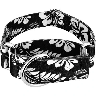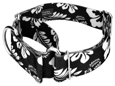 Is your escape artist slipping out of their collar? Martingale collars are designed to prevent your pup from pulling out of their collar by tightening around your dog’s neck whenever they try to remove their heads. Once your dog quits pulling, the collar relaxes again. Perfect for training, the twin-loop design gives you control over your stroll. The martingale collar is often referred to as a humane choke collar because it naturally limits how much it tightens, ensuring your dog’s safety. A no-slip, adjustable, limited choke collar is an excellent solution for sighthounds who slip out of their collars.Light up the tikis and put on your grass skirt because we have the perfect tropical getaway for you! Experience the tranquility of the tropics with this 1 1/2 inch Black Hawaiian Martingale Dog Collar. Printed using state-of-the-art colorfast inks, our collars will not run or bleed. Crafted from industry-leading hardware and webbing, Country Brook Petz’ 1 1/2 Inch Black Hawaiian Martingale Dog Collars stand up under tough conditions, all while keeping your furry friend looking fab.By adjusting the metal slide, you give slack to the loop. Slip it over your dog’s neck and decrease size until you can comfortably slip only two fingers under the collar. The unique limited closure prevents the choke from becoming too tight. We at Country Brook Petz pride ourselves on only using the best hardware, and you can rest assured that these collars will withstand whatever your pup gets into. Our collars have wide-mouthed heavy-duty triglides for easy adjustment and heavy-welded D-rings for strength.