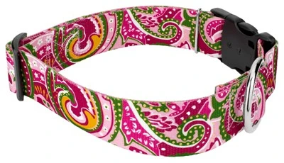 Enjoy this sophisticated Pink Paisley 1 1/2 Inch Deluxe Dog Collar from Country Brook Petz. Featuring a classy pink and green paisley design, your pet will feel debonair while sporting this pattern.At the heart of this exceptional collar lies our premium polyester webbing, a high-strength and resilient material known for its remarkable durability. Whether your dog is a spirited explorer or a playful companion, this collar can withstand the test of time and keep up with their boundless energy.The sleek and smooth texture of the polyester webbing ensures a gentle touch against your dog’s neck, eliminating any discomfort or irritation. Your loyal companion will revel in the luxurious comfort that this collar provides, allowing them to strut their stuff with unmatched confidence.To further elevate the collar’s functionality, we constructed it with YKK brand buckles, renowned for their exceptional quality and reliability. These buckles are not only stylish but also incredibly secure, giving you peace of mind knowing that your furry friend is always safe and sound.The YKK brand buckles are engineered with precision, featuring a seamless interlocking mechanism that guarantees a secure fit. They are easy to use and offer a hassle-free experience, allowing you to fasten and release the collar with a simple snap effortlessly. Whether you’re preparing for a leisurely stroll or an exciting outdoor adventure, this collar ensures quick and convenient handling.Besides its undeniable elegance, our Deluxe Dog Collar is also equipped with a sturdy welded D-ring for easy leash attachment. This feature guarantees a seamless transition from playtime to outdoor walks, allowing you to maintain control without compromising on style or comfort.Indulge your furry friend in the opulence they deserve with our Deluxe Dog Collar. From the premium polyester webbing to the renowned YKK brand buckles, every aspect of this collar is a testament to superior craftsmanship and unparalleled quality made right here in America. Give your loyal companion the gift of comfort and style, and watch them turn heads wherever they go.