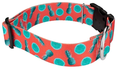 Recall hazy summer nights, neon lights, and palm tree sights. Tropical Tango keeps the rhythm bumping with luscious pineapples and tangy lemon slices perfectly perched in a saucy teal and coral colorway.At the heart of this exceptional collar lies our premium polyester webbing, a high-strength and resilient material known for its remarkable durability. Whether your dog is a spirited explorer or a playful companion, this collar can withstand the test of time and keep up with their boundless energy.The sleek and smooth texture of the polyester webbing ensures a gentle touch against your dog’s neck, eliminating any discomfort or irritation. Your loyal companion will revel in the luxurious comfort that this collar provides, allowing them to strut their stuff with unmatched confidence.To further elevate the collar’s functionality, we constructed it with YKK brand buckles, renowned for their exceptional quality and reliability. These buckles are not only stylish but also incredibly secure, giving you peace of mind knowing that your furry friend is always safe and sound.The YKK brand buckles are engineered with precision, featuring a seamless interlocking mechanism that guarantees a secure fit. They are easy to use and offer a hassle-free experience, allowing you to fasten and release the collar with a simple snap effortlessly. Whether you’re preparing for a leisurely stroll or an exciting outdoor adventure, this collar ensures quick and convenient handling.Besides its undeniable elegance, our Deluxe Dog Collar is also equipped with a sturdy welded D-ring for easy leash attachment. This feature guarantees a seamless transition from playtime to outdoor walks, allowing you to maintain control without compromising on style or comfort.Indulge your furry friend in the opulence they deserve with our Deluxe Dog Collar. From the premium polyester webbing to the renowned YKK brand buckles, every aspect of this collar is a testament to superior craftsmanship and unparalleled quality made right here in America. Give your loyal companion the gift of comfort and style, and watch them turn heads wherever they go.