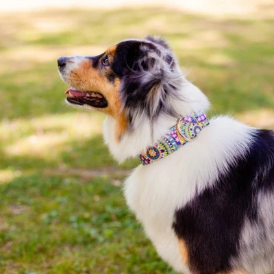 Get your free spirit on with our 1 1/2 Inch Yellow Boho Mandala Deluxe Dog Collar. This far out dog collar features funky color combinations that’ll show your pet’s chill nature. Bursts of yellow flow throughout while numerous other vivid colors compliment the design.At the heart of this exceptional collar lies our premium polyester webbing, a high-strength and resilient material known for its remarkable durability. Whether your dog is a spirited explorer or a playful companion, this collar can withstand the test of time and keep up with their boundless energy.The sleek and smooth texture of the polyester webbing ensures a gentle touch against your dog’s neck, eliminating any discomfort or irritation. Your loyal companion will revel in the luxurious comfort that this collar provides, allowing them to strut their stuff with unmatched confidence.To further elevate the collar’s functionality, we constructed it with YKK brand buckles, renowned for their exceptional quality and reliability. These buckles are not only stylish but also incredibly secure, giving you peace of mind knowing that your furry friend is always safe and sound.The YKK brand buckles are engineered with precision, featuring a seamless interlocking mechanism that guarantees a secure fit. They are easy to use and offer a hassle-free experience, allowing you to fasten and release the collar with a simple snap effortlessly. Whether you’re preparing for a leisurely stroll or an exciting outdoor adventure, this collar ensures quick and convenient handling.Besides its undeniable elegance, our Deluxe Dog Collar is also equipped with a sturdy welded D-ring for easy leash attachment. This feature guarantees a seamless transition from playtime to outdoor walks, allowing you to maintain control without compromising on style or comfort.Indulge your furry friend in the opulence they deserve with our Deluxe Dog Collar. From the premium polyester webbing to the renowned YKK brand buckles, every aspect of this collar is a testament to superior craftsmanship and unparalleled quality made right here in America. Give your loyal companion the gift of comfort and style, and watch them turn heads wherever they go.