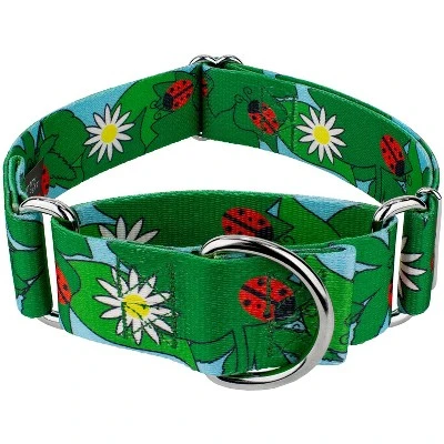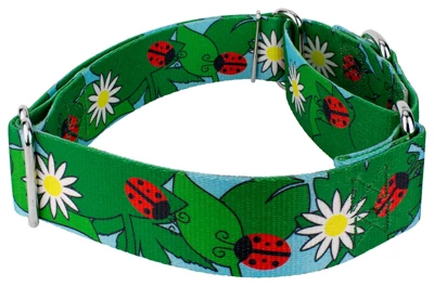 Is your escape artist slipping out of their collar? Martingale collars are designed to prevent your pup from pulling out of their collar by tightening around your dog’s neck whenever they try to remove their heads. Once your dog quits pulling, the collar relaxes again. Perfect for training, the twin-loop design gives you control over your stroll. The martingale collar is often referred to as a humane choke collar because it naturally limits how much it tightens, ensuring your dog’s safety. A no-slip, adjustable, limited choke collar is an excellent solution for sighthounds who slip out of their collars.Experience the tranquility of a Spring picnic with Country Brook Petz’ 1 1/2 Inch Ladybug Picnic Martingale Dog Collar! Adorable ladybugs crawl across a pattern of leaves and daisy flowers. This vividly colored pattern will bring a fresh breeze of spring for you and your pup/kitty. Printed using state-of-the-art colorfast inks, our collars will not run or bleed. Crafted from industry-leading hardware and webbing, Country Brook Petz’ 1 1/2 Inch Ladybug Picnic Martingale Dog Collars stand up under tough conditions, all while keeping your furry friend looking fab.By adjusting the metal slide, you give slack to the loop. Slip it over your dog’s neck and decrease size until you can comfortably slip only two fingers under the collar. The unique limited closure prevents the choke from becoming too tight. We at Country Brook Petz pride ourselves on only using the best hardware, and you can rest assured that these collars will withstand whatever your pup gets into. Our collars have wide-mouthed heavy-duty triglides for easy adjustment and heavy-welded D-rings for strength.