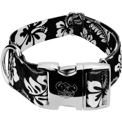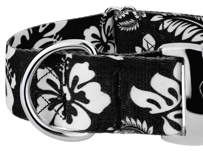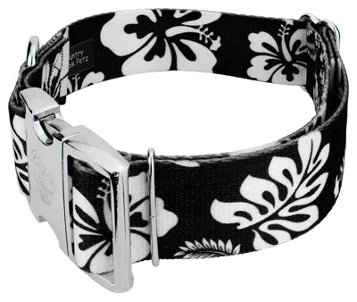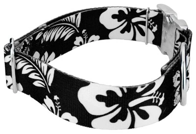 Light up the tikis and put on your grass skirt because we have the perfect tropical getaway for you! Experience the tranquility of the tropics with this 1 1/2 Inch Premium Black Hawaiian Dog Collar.Crafted with care and attention to detail, our classy premium line of collars are for canines who need to look fabulous both at home and at the dog park. It starts with the highest quality 100% polyester webbing that is both soft and strong. This means the collar will feel like a hug whenever your dog wears it, but it also provides long-lasting durability to withstand everyday adventures.The collar features a brilliant aluminum side-release buckle with a mirror-like finish, allowing easy and secure fastening. The sturdy welded D-ring provides a convenient attachment point for your dog’s leash, ensuring a safe and controlled walking experience.Country Brook Petz’ premium patterned collars are vibrant, comfortable collars made right here in the U.S.A. Our carefully curated sewing professionals have decades of combined experience and ensure that every collar is meticulously inspected for quality craftsmanship. With an array of eye-catching patterns, you can showcase your dog’s unique personality and style. From trendy florals to playful geometric designs, there’s a pattern to suit every taste and preference.