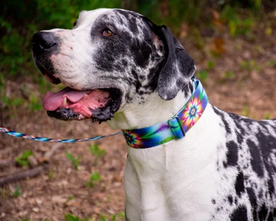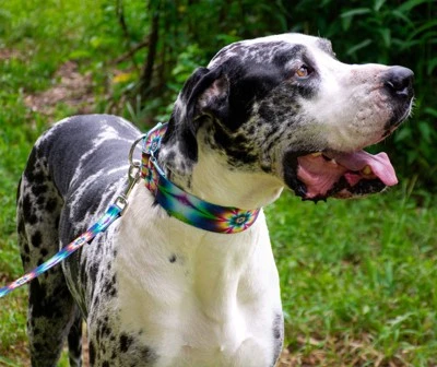 Is your escape artist slipping out of their collar? Martingale collars are designed to prevent your pup from pulling out of their collar by tightening around your dog’s neck whenever they try to remove their heads. Once your dog quits pulling, the collar relaxes again. Perfect for training, the twin-loop design gives you control over your stroll. The martingale collar is often referred to as a humane choke collar because it naturally limits how much it tightens, ensuring your dog’s safety. A no-slip, adjustable, limited choke collar is an excellent solution for sighthounds who slip out of their collars.Check out this totally awesome Tie Dye Flowers 1 1/2 Inch Martingale Dog Collar from Country Brook Petz. Vividly colored flowers jump out at you in a psychedelic pattern. This kaleidoscopic design will bring all eyes to your pup. Printed using state-of-the-art colorfast inks, our collars will not run or bleed. Crafted from industry-leading hardware and webbing, Country Brook Petz’ 1 1/2 Inch Tie Dye Flowers Martingale Dog Collars stand up under tough conditions, all while keeping your furry friend looking fab.By adjusting the metal slide, you give slack to the loop. Slip it over your dog’s neck and decrease size until you can comfortably slip only two fingers under the collar. The unique limited closure prevents the choke from becoming too tight. We at Country Brook Petz pride ourselves on only using the best hardware, and you can rest assured that these collars will withstand whatever your pup gets into. Our collars have wide-mouthed heavy-duty triglides for easy adjustment and heavy-welded D-rings for strength.