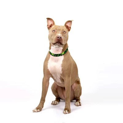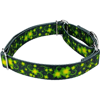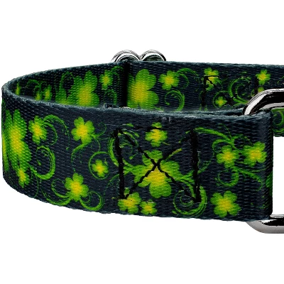 Your pup won’t be pinched while sporting this Country Brook Petz Clovers in the wind Martingale Dog Collar. Clovers in the wind is a vibrant design that features whimsical four leaf clovers among a contrasting black background. In the foreground, green hued swirls flow throughout, frolicking among other tiny clovers. Printed using our colorfast dye, our collars will not run or bleed. Created from superior hardware and webbing, Country Brook Petz’ Clovers in the wind Martingale Dog Collars will not only provide your pup with a trendy collar, but will give you a sense of ease when using our products.Is your good boy or girl slipping out of their collar? Well, our martingale collars are designed to prevent your pup from pulling out of their collar by tightening around your dog’s neck whenever they try to remove their heads. Once Fido quits pulling, the collar relaxes against their neck. Perfect for training, the twin loop design gives you control over your stroll. The martingale collar is often referred to as a humane choke collar. A no-slip, adjustable-choke collar is an excellent solution for sighthounds who slip out of their collars.The Extra Small, Mini and Micro are still reliable with a 700 lb. tensile strength, even though they may seem delicate.By adjusting the metal slide, you give slack to the loop. Slip it over your dog’s neck and decrease size until you can comfortably slip only a couple of fingers under the collar. The unique limited closure prevents the choke from becoming too tight. We at Country Brook Petz pride ourselves on only using the best hardware and you can rest assured that these collars will withstand whatever your pup brings its way. Our collars have wide-mouthed heavy-duty triglides for easy adjustment and heavy-welded D-rings for strength. Designed to give you back control while your pup is leashed.