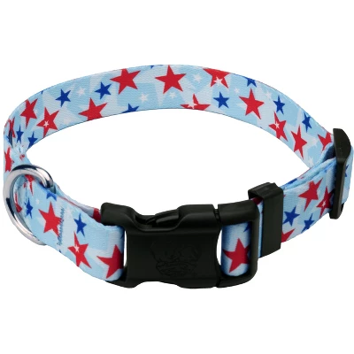Like a picnic on Independence Day, this pattern evokes memories of a hazy summer day playing in the sprinkler, eating hot dogs, and waving sparklers. Lively red, white, and blue stars burst throughout this American Celebration Deluxe Dog Collar in celebration of everything America represents.At the heart of this exceptional collar lies our premium polyester webbing, a high-strength and resilient material known for its remarkable durability. Whether your dog is a spirited explorer or a playful companion, this collar can withstand the test of time and keep up with their boundless energy.The sleek and smooth texture of the polyester webbing ensures a gentle touch against your dog’s neck, eliminating any discomfort or irritation. Your loyal companion will revel in the luxurious comfort that this collar provides, allowing them to strut their stuff with unmatched confidence.To further elevate the collar’s functionality, we constructed it with YKK brand buckles, renowned for their exceptional quality and reliability. These buckles are not only stylish but also incredibly secure, giving you peace of mind knowing that your furry friend is always safe and sound.The YKK brand buckles are engineered with precision, featuring a seamless interlocking mechanism that guarantees a secure fit. They are easy to use and offer a hassle-free experience, allowing you to fasten and release the collar with a simple snap effortlessly. Whether you’re preparing for a leisurely stroll or an exciting outdoor adventure, this collar ensures quick and convenient handling.Besides its undeniable elegance, our Deluxe Dog Collar is also equipped with a sturdy welded D-ring for easy leash attachment. This feature guarantees a seamless transition from playtime to outdoor walks, allowing you to maintain control without compromising on style or comfort.Please note that while the Extra Small, 2XS, and 3XS sizes may seem delicate, they are still reliable with an impressive 700 lb. tensile strengthIndulge your furry friend in the opulence they deserve with our Deluxe Dog Collar. From the premium polyester webbing to the renowned YKK brand buckles, every aspect of this collar is a testament to superior craftsmanship and unparalleled quality made right here in America. Give your loyal companion the gift of comfort and style, and watch them turn heads wherever they go.