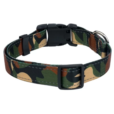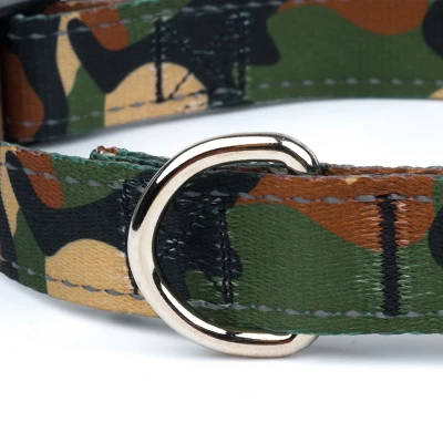 Our Deluxe Woodland Camo Reflective Collar is a stylish accessory that is safe, comfortable, and made right here in the U.S.A. Featuring two woven strips of reflective webbing, our deluxe reflective dog collar is ideal for night safety. These collars are constructed using strong polyester webbing, durable plastic buckles, heavy-duty wide-mouthed triglides, and heavy welded D-rings. Ribbed, soft, sleek to the touch, and a bit of sheen, these collars not only offer safety, but will make your pup look great!We only use the best hardware. Our collars have strong, plastic buckles for your dog’s comfort. Wide-mouthed, heavy-duty triglides make for easy adjustments. The heavy-welded D-rings offer safety for your pup. Country Brook Design cannot be held responsible for misuse of this product. It is the responsibility of the purchaser to determine the suitability of the product for their use.