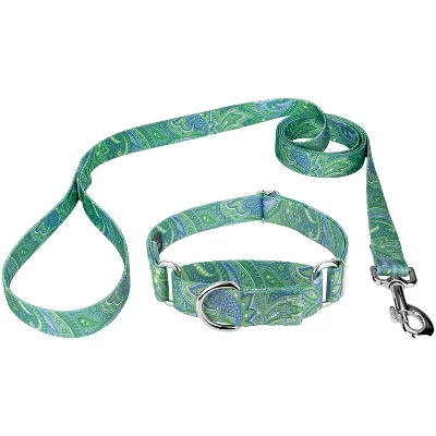 Enjoy this sophisticated Green Paisley Martingale Dog Collar & Leash from Country Brook Petz. Featuring a classy blue and green paisley design, your pet will feel debonair while sporting this pattern. When you order this dog collar and leash set, you will receive a martingale collar and a matching leash; collar size of your choice with an accompanying 6 foot leash. These Green Paisley collar and leash sets are uniquely designed and have a silky smooth polyester loop that slips over your hand, giving you a comfortable grip while walking your pet; box stitching ensures strength for when your pup pulls against their leash.The Extra Small, Mini and Micro are still reliable with a 700 lb. tensile strength, even though they may seem delicate.Our martingale collars are designed to prevent your pup from pulling out of their collar by tightening around your dog’s neck whenever they try to remove their heads. Perfect for training, the twin loop design gives you control over your stroll. By adjusting the metal slide, you give slack to the loop. Slip it over your dog’s neck and decrease size until you can comfortably slip only a couple of fingers under the collar. The unique limited closure prevents the choke from becoming too tight. We at Country Brook Petz pride ourselves on only using the best hardware and you can rest assured that these collars will withstand whatever your pup brings its way. Our collars have wide-mouthed heavy-duty triglides for easy adjustment and heavy-welded D-rings for strength. Designed to give you back control while your pup is leashed.