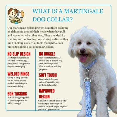 Is your escape artist slipping out of their collar? Martingale collars are designed to prevent your pup from pulling out of their collar by tightening around your dog’s neck whenever they try to remove their heads. Once your dog quits pulling, the collar relaxes again. Perfect for training, the twin-loop design gives you control over your stroll. The martingale collar is often referred to as a humane choke collar because it naturally limits how much it tightens, ensuring your dog’s safety. A no-slip, adjustable, limited choke collar is an excellent solution for sighthounds who slip out of their collars.Take a walk on the creative side with this collection of unique abstract 1 1/2 Inch Martingale Dog Collars. Printed using state-of-the-art colorfast inks, our collars will not run or bleed. Crafted from industry-leading hardware and webbing, Country Brook Petz’ Abstract Collection Martingale Dog Collars stand up under tough conditions, all while keeping your furry friend looking fab.By adjusting the metal slide, you give slack to the loop. Slip it over your dog’s neck and decrease size until you can comfortably slip only two fingers under the collar. The unique limited closure prevents the choke from becoming too tight. We at Country Brook Petz pride ourselves on only using the best hardware, and you can rest assured that these collars will withstand whatever your pup gets into. Our collars have wide-mouthed heavy-duty triglides for easy adjustment and heavy-welded D-rings for strength.Country Brook Design cannot be held responsible for misuse of this product. It is the responsibility of the purchaser to determine the suitability of the product for their use.