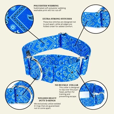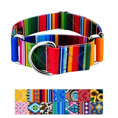 Is your escape artist slipping out of their collar? Martingale collars are designed to prevent your pup from pulling out of their collar by tightening around your dog’s neck whenever they try to remove their heads. Once your dog quits pulling, the collar relaxes again. Perfect for training, the twin-loop design gives you control over your stroll. The martingale collar is often referred to as a humane choke collar because it naturally limits how much it tightens, ensuring your dog’s safety. A no-slip, adjustable, limited choke collar is an excellent solution for sighthounds who slip out of their collars.This Western Collection of 1 1/2 Inch Martingale Dog Collars embraces the essence of country life with a wide variety of rustic designs. Printed using state-of-the-art colorfast inks, our collars will not run or bleed. Crafted from industry-leading hardware and webbing, Country Brook Petz’ Country and Western Collection of Martingale Dog Collars stand up under tough conditions, all while keeping your furry friend looking fab.By adjusting the metal slide, you give slack to the loop. Slip it over your dog’s neck and decrease size until you can comfortably slip only two fingers under the collar. The unique limited closure prevents the choke from becoming too tight. We at Country Brook Petz pride ourselves on only using the best hardware, and you can rest assured that these collars will withstand whatever your pup gets into. Our collars have wide-mouthed heavy-duty triglides for easy adjustment and heavy-welded D-rings for strength.Country Brook Design cannot be held responsible for misuse of this product. It is the responsibility of the purchaser to determine the suitability of the product for their use.