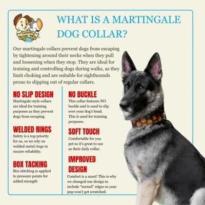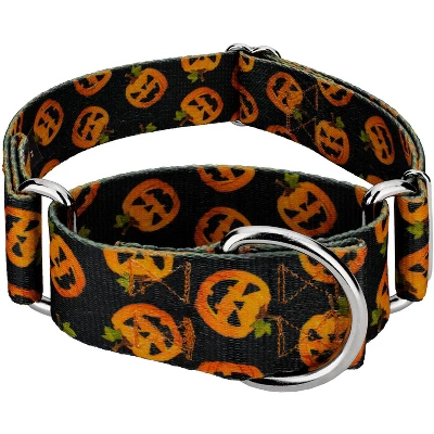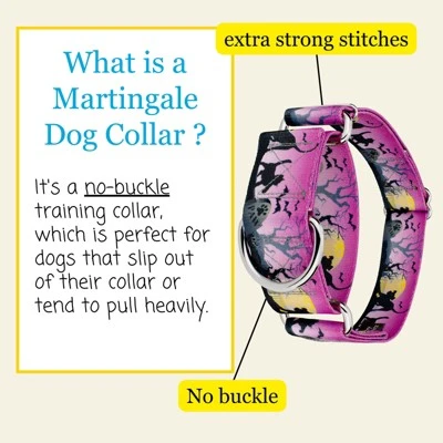 Is your escape artist slipping out of their collar? Martingale collars are designed to prevent your pup from pulling out of their collar by tightening around your dog’s neck whenever they try to remove their heads. Once your dog quits pulling, the collar relaxes again. Perfect for training, the twin-loop design gives you control over your stroll. The martingale collar is often referred to as a humane choke collar because it naturally limits how much it tightens, ensuring your dog’s safety. A no-slip, adjustable, limited choke collar is an excellent solution for sighthounds who slip out of their collars.Country Brook Petz’ 1 1/2 Inch Martingale Dog Collar Halloween Collection is here to put a spell on you. We’ve conjured up our most gruesome designs for this frightful season with your pup in mind! These bewitching patterns are as trendy as they are spooky. Printed using state-of-the-art colorfast inks, our collars will not run or bleed. Crafted from industry-leading hardware and webbing, Country Brook Petz’ 1 1/2 Inch Halloween Collection of Martingale Dog Collars stand up under tough conditions, all while keeping your furry friend looking fab.By adjusting the metal slide, you give slack to the loop. Slip it over your dog’s neck and decrease size until you can comfortably slip only two fingers under the collar. The unique limited closure prevents the choke from becoming too tight. We at Country Brook Petz pride ourselves on only using the best hardware, and you can rest assured that these collars will withstand whatever your pup gets into. Our collars have wide-mouthed heavy-duty triglides for easy adjustment and heavy-welded D-rings for strength.Country Brook Design cannot be held responsible for misuse of this product. It is the responsibility of the purchaser to determine the suitability of the product for their use.