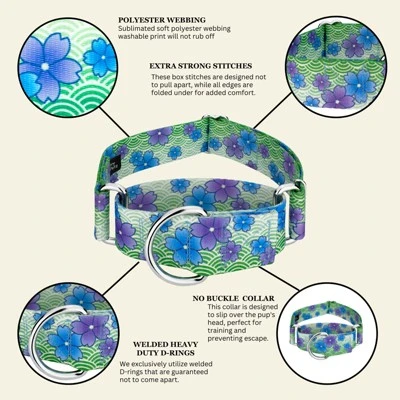 Is your escape artist slipping out of their collar? Martingale collars are designed to prevent your pup from pulling out of their collar by tightening around your dog’s neck whenever they try to remove their heads. Once your dog quits pulling, the collar relaxes again. Perfect for training, the twin-loop design gives you control over your stroll. The martingale collar is often referred to as a humane choke collar because it naturally limits how much it tightens, ensuring your dog’s safety. A no-slip, adjustable, limited choke collar is an excellent solution for sighthounds who slip out of their collars.Breathe in the aroma of springtime with this 1 1/2 Inch Martingale Dog Collar Spring Collection. Featuring bunnies, eggs, florals, and all things Spring. Printed using state-of-the-art colorfast inks, our collars will not run or bleed. Crafted from industry-leading hardware and webbing, Country Brook Petz’ 1 1/2 Inch Spring Collection of Martingale Dog Collars stand up under tough conditions, all while keeping your furry friend looking fab.By adjusting the metal slide, you give slack to the loop. Slip it over your dog’s neck and decrease size until you can comfortably slip only two fingers under the collar. The unique limited closure prevents the choke from becoming too tight. We at Country Brook Petz pride ourselves on only using the best hardware, and you can rest assured that these collars will withstand whatever your pup gets into. Our collars have wide-mouthed heavy-duty triglides for easy adjustment and heavy-welded D-rings for strength.Country Brook Design cannot be held responsible for misuse of this product. It is the responsibility of the purchaser to determine the suitability of the product for their use.