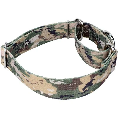 Strike your prey with Country Brook Petz’ Mountain Viper Camo Martingale Dog Collar. Earthy tans, softened greens, and light browns create a color pattern that is indicative of mountain forestry. The chameleon-like camo allows you to hide in plain sight and creates an ideal cover for fallen foliage or piles of leaves. Small and sporadic colors create the illusion of mimicry and allow your pup to blend in naturally with their surroundings. Printed using our colorfast dye, there are no runs or bleeding onto your pupper. Made from superior hardware and webbing, Country Brook Petz’ Mountain Viper Camo Martingale Dog Collar will provide you with not only trendy pup attire, but a sense of ease when using our products. Is your good boy or girl slipping out of their collar? Well, our martingale collars are designed to prevent your pup from pulling out of their collar by tightening around your dog’s neck whenever they try to remove their heads. Once Fido quits pulling, the collar relaxes against their neck. Perfect for training, the twin loop design gives you control over your stroll. The martingale collar is often referred to as a humane choke collar. A no-slip, adjustable-choke collar is an excellent solution for sighthounds who slip out of their collars. The Extra Small, Mini and Micro are still reliable with a 700 lb. tensile strength, even though they may seem delicate.By adjusting the metal slide, you give slack to the loop. Slip it over your dog’s neck and decrease size until you can comfortably slip only a couple of fingers under the collar. The unique limited closure prevents the choke from becoming too tight. We at Country Brook Petz pride ourselves on only using the best hardware and you can rest assured that these collars will withstand whatever your pup brings its way. Our collars have wide-mouthed heavy-duty triglides for easy adjustment and heavy-welded D-rings for strength. Designed to give you back control while your pup is leashed.