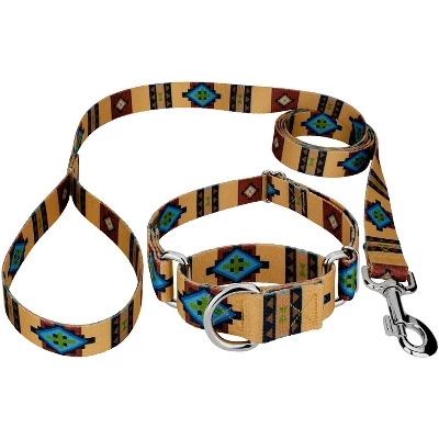 Country Brook Petz’ Native Arizona Martingale Dog Collar & Leash is a contemporary interpretation of a classic, traditional Native American print with blue hues complemented by rich blacks, beige, deep browns, and ice blues; the geometric formations are crisp and well defined. When you order this dog collar and leash set, you will receive a martingale collar and a matching leash; collar size of your choice with an accompanying 6 foot leash. These Native Arizona collar and leash sets are uniquely designed and have a silky smooth polyester loop that slips over your hand, giving you a comfortable grip while walking your pet; box stitching ensures strength for when your pup pulls against their leash.The Extra Small, Mini and Micro are still reliable with a 700 lb. tensile strength, even though they may seem delicate.Our martingale collars are designed to prevent your pup from pulling out of their collar by tightening around your dog’s neck whenever they try to remove their heads. Perfect for training, the twin loop design gives you control over your stroll. By adjusting the metal slide, you give slack to the loop. Slip it over your dog’s neck and decrease size until you can comfortably slip only a couple of fingers under the collar. The unique limited closure prevents the choke from becoming too tight. We at Country Brook Petz pride ourselves on only using the best hardware and you can rest assured that these collars will withstand whatever your pup brings its way. Our collars have wide-mouthed heavy-duty triglides for easy adjustment and heavy-welded D-rings for strength. Designed to give you back control while your pup is leashed.Country Brook Design cannot be held responsible for misuse of this product. It is the responsibility of the purchaser to determine the suitability of the product for their use.