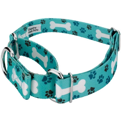 Bark up the right tree with our Oh My Dog Martingale Dog Collars. A beautiful teal background features paw prints scattered throughout the design with prominent white bones standing out from the collar. You’ll be rolling over with excitement over how cute this pattern is! Printed using our colorfast dye, our collars will not run or bleed. Created from superior hardware and webbing, Country Brook Petz’ Oh My Dog Martingale Dog Collars will not only provide your pup with a trendy collar, but will give you a sense of ease when using our products.Is your good boy or girl slipping out of their collar? Well, our martingale collars are designed to prevent your pup from pulling out of their collar by tightening around your dog’s neck whenever they try to remove their heads. Once Fido quits pulling, the collar relaxes against their neck. Perfect for training, the twin loop design gives you control over your stroll. The martingale collar is often referred to as a humane choke collar. A no-slip, adjustable-choke collar is an excellent solution for sighthounds who slip out of their collars.The Extra Small, Mini and Micro are still reliable with a 700 lb. tensile strength, even though they may seem delicate.By adjusting the metal slide, you give slack to the loop. Slip it over your dog’s neck and decrease size until you can comfortably slip only a couple of fingers under the collar. The unique limited closure prevents the choke from becoming too tight. We at Country Brook Petz pride ourselves on only using the best hardware and you can rest assured that these collars will withstand whatever your pup brings its way. Our collars have wide-mouthed heavy-duty triglides for easy adjustment and heavy-welded D-rings for strength. Designed to give you back control while your pup is leashed.