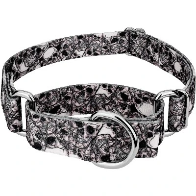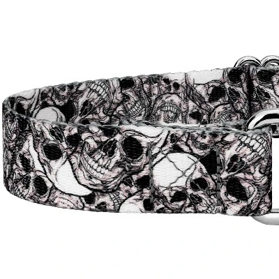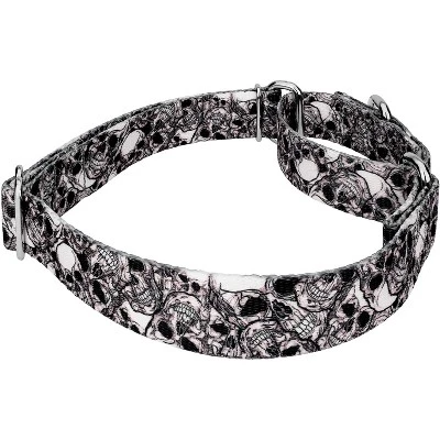 Is your escape artist slipping out of their collar? Martingale collars are designed to prevent your pup from pulling out of their collar by tightening around your dog’s neck whenever they try to remove their heads. Once your dog quits pulling, the collar relaxes again. Perfect for training, the twin-loop design gives you control over your stroll. The martingale collar is often referred to as a humane choke collar because it naturally limits how much it tightens, ensuring your dog’s safety. A no-slip, adjustable, limited choke collar is an excellent solution for sighthounds who slip out of their collars.Whether you’re into metal, rock, bikes or anything macabre, this Phantom Skulls Martingale Dog Collar allows you to show your dark side. Rugged skulls are placed in a stacked arrangement featuring pops of white and desolate pitch-blacks. Printed using state-of-the-art colorfast inks, our collars will not run or bleed. Crafted from industry-leading hardware and webbing, Country Brook Petz’ Phantom Skulls Martingale Dog Collars stand up under tough conditions, all while keeping your furry friend looking fab.By adjusting the metal slide, you give slack to the loop. Slip it over your dog’s neck and decrease size until you can comfortably slip only two fingers under the collar. The unique limited closure prevents the choke from becoming too tight. We at Country Brook Petz pride ourselves on only using the best hardware, and you can rest assured that these collars will withstand whatever your pup gets into. Our collars have wide-mouthed heavy-duty triglides for easy adjustment and heavy-welded D-rings for strength.Country Brook Design cannot be held responsible for misuse of this product. It is the responsibility of the purchaser to determine the suitability of the product for their use.