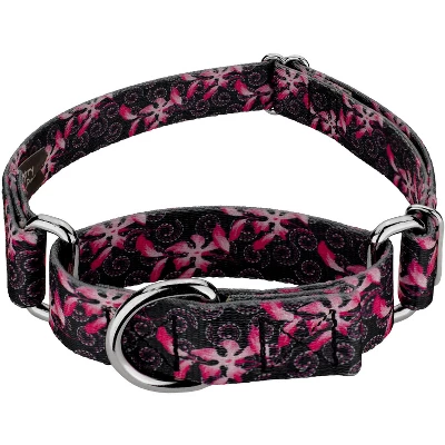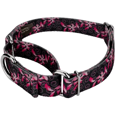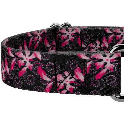 Smell the aroma of Spring with our Pink Honeysuckle Breeze Martingale Dog Collar. Vibrant, pink honeysuckle petals contrast against a rich, black background with swirling lines that bring this print to life. Printed using our colorfast dye, our collars will not run or bleed. Created from superior hardware and webbing, Country Brook Petz’ Pink Honeysuckle Breeze Martingale Dog Collars will not only provide your pup with a trendy collar, but will give you a sense of ease when using our products.Is your good boy or girl slipping out of their collar? Well, our martingale collars are designed to prevent your pup from pulling out of their collar by tightening around your dog’s neck whenever they try to remove their heads. Once Fido quits pulling, the collar relaxes against their neck. Perfect for training, the twin loop design gives you control over your stroll. The martingale collar is often referred to as a humane choke collar. A no-slip, adjustable-choke collar is an excellent solution for sighthounds who slip out of their collars.The Extra Small, Mini and Micro are still reliable with a 700 lb. tensile strength, even though they may seem delicate.By adjusting the metal slide, you give slack to the loop. Slip it over your dog’s neck and decrease size until you can comfortably slip only a couple of fingers under the collar. The unique limited closure prevents the choke from becoming too tight. We at Country Brook Petz pride ourselves on only using the best hardware and you can rest assured that these collars will withstand whatever your pup brings its way. Our collars have wide-mouthed heavy-duty triglides for easy adjustment and heavy-welded D-rings for strength. Designed to give you back control while your pup is leashed.
