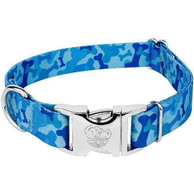 Are you bone tired of all the other camo prints out there? Well, Country Brook Petz has their own ”bad to the bone” design that will compliment your camouflaged pup. Contrasting shades of blue highlight the bone accents perfectly while giving you a unique composition of design. Printed using our colorfast dye, our collars will not run or bleed. Created from superior hardware and webbing, Country Brook Petz’ Blue Bone Premium Dog Collars will not only provide your pup with a trendy collar, but will give you a sense of ease when using our products.Country Brook Petz’ premium patterned collars are vibrant, comfortable collars made right here in the U.S.A. These collars are constructed using strong polyester webbing, dependable metal side release buckles that feature a brilliant mirror finish, heavy-duty wide-mouthed triglides, and heavy welded D-rings. Our polyester collars are ribbed, soft, and sleek to the touch with a little bit of a sheen. Country Brook makes all their collars after the order has been placed. However, rest assured as your collar will ship within two business days of receiving payment.We want your furbaby to be able to show the world their new collar immediately, so be sure to measure for the right size. You can check this out by using a string, or tape measure, to see where the collar will fit snugly and comfortably on your dog’s neck. These stylish prints work well with both boy and girl puppers.