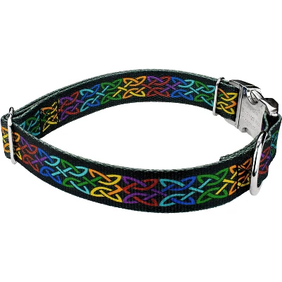 Show your pride with this Celtic Pride Premium Dog Collar and Leash. Featuring multi-colored ombre knots intertwining throughout a black background. Printed using our colorfast dye, our collars will not run or bleed. Created from superior hardware and webbing, Country Brook Petz’ Premium Dog Collar and Leash will not only provide your pup with a trendy collar, but will give you a sense of ease when using our products. When you order this dog collar and leash set, you will receive a premium collar and a matching leash; collar size of your choice with an accompanying 6 foot leash.These collar and leash sets are uniquely designed and have a silky smooth polyester loop that slips over your hand, giving you a comfortable grip while walking your pet; box stitching ensures strength for when your pup pulls against their leash. These collars and leashes are washable, with mild detergent, and dry when laid out. Country Brook Petz’ premium patterned collars are vibrant, comfortable collars made right here in the U.S.A. These collars are constructed using strong polyester webbing, dependable metal side release buckles that feature a brilliant mirror finish, heavy-duty wide-mouthed triglides, and heavy welded D-rings.We want your furbaby to be able to show the world their new collar immediately, so be sure to measure for the right size. You can check this out by using a string, or tape measure, to see where the collar will fit snugly and comfortably on your dog’s neck. These stylish prints work well with both boy and girl puppers.