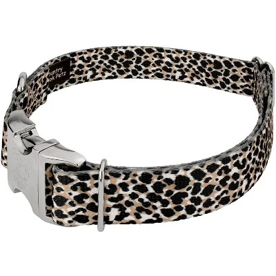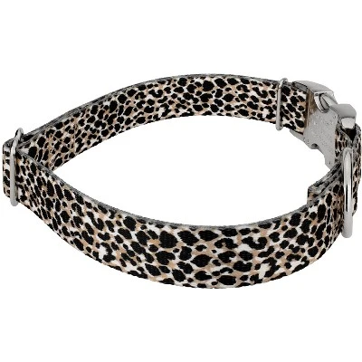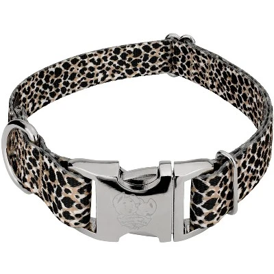 Take a walk on the wild side with this Premium Cheetah Dog Collar. Featuring a life-like cheetah print in shades of beige and black, this collar will make you feel like you’re on safari! Printed using our colorfast dye, our collars will not run or bleed. Created from superior hardware and webbing, Country Brook Petz’ Cheetah Premium Dog Collars will not only provide your pup with a trendy collar, but will give you a sense of ease when using our products.Country Brook Petz’ premium patterned collars are vibrant, comfortable collars made right here in the U.S.A. These collars are constructed using strong polyester webbing, dependable metal side release buckles that feature a brilliant mirror finish, heavy-duty wide-mouthed triglides, and heavy welded D-rings. Our polyester collars are ribbed, soft, and sleek to the touch with a little bit of a sheen. Country Brook makes all their collars after the order has been placed. However, rest assured as your collar will ship within two business days of receiving payment.We want your furbaby to be able to show the world their new collar immediately, so be sure to measure for the right size. You can check this out by using a string, or tape measure, to see where the collar will fit snugly and comfortably on your dog’s neck. These stylish prints work well with both boy and girl puppers.