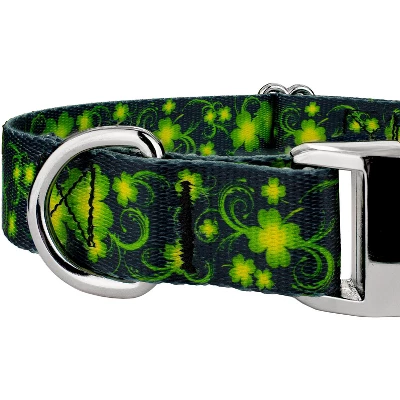 Your pup won’t be pinched while sporting this Country Brook Petz Premium Dog Collar. Clovers in the wind is a vibrant design that features whimsical four leaf clovers among a contrasting black background. In the foreground, green hued swirls flow throughout, frolicking among other tiny clovers. Printed using our colorfast dye, our collars will not run or bleed. Created from superior hardware and webbing, Country Brook Petz’ Clovers in the Wind Premium Dog Collars will not only provide your pup with a trendy collar, but will give you a sense of ease when using our products.Country Brook Petz’ premium patterned collars are vibrant, comfortable collars made right here in the U.S.A. These collars are constructed using strong polyester webbing, dependable metal side release buckles that feature a brilliant mirror finish, heavy-duty wide-mouthed triglides, and heavy welded D-rings. Our polyester collars are ribbed, soft, and sleek to the touch with a little bit of a sheen. Country Brook makes all their collars after the order has been placed. However, rest assured as your collar will ship within two business days of receiving payment.We want your furbaby to be able to show the world their new collar immediately, so be sure to measure for the right size. You can check this out by using a string, or tape measure, to see where the collar will fit snugly and comfortably on your dog’s neck. These stylish prints work well with both boy and girl puppers.
