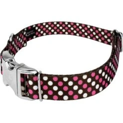 Never go out of style with this traditional polka dot pattern. This Shibuya Premium Dog Collar features a chocolate brown background with white and bubblegum pink dots dispersed throughout Printed using our colorfast dye, our collars will not run or bleed. Created from superior hardware and webbing, Country Brook Petz’ Shibuya Premium Dog Collars will not only provide your pup with a trendy collar, but will give you a sense of ease when using our products.Country Brook Petz’ premium patterned collars are vibrant, comfortable collars made right here in the U.S.A. These collars are constructed using strong polyester webbing, dependable metal side release buckles that feature a brilliant mirror finish, heavy-duty wide-mouthed triglides, and heavy welded D-rings. Our polyester collars are ribbed, soft, and sleek to the touch with a little bit of a sheen. Country Brook makes all their collars after the order has been placed. However, rest assured as your collar will ship within two business days of receiving payment.We want your furbaby to be able to show the world their new collar immediately, so be sure to measure for the right size. You can check this out by using a string, or tape measure, to see where the collar will fit snugly and comfortably on your dog’s neck. These stylish prints work well with both boy and girl puppers.