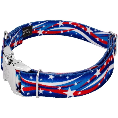 Freedom doesn’t knock, it rings and with Country Brook Petz’ Star Spangled Premium Dog Collar and Leash your pet will have the perfect design to show the world their patriotic pride. Made right here in the U.S. of A, this star spangled print will brighten your doggo’s attire like it’s the Fourth of July. These red, white, and blue complementary colors will contrast great while showing the world where your allegiance lies. Printed using our colorfast dye, our collars will not run or bleed. Created from superior hardware and webbing, Country Brook Petz’ Premium Dog Collar and Leash will not only provide your pup with a trendy collar, but will give you a sense of ease when using our products. When you order this dog collar and leash set, you will receive a premium collar and a matching leash; collar size of your choice with an accompanying 6 foot leash.These collar and leash sets are uniquely designed and have a silky smooth polyester loop that slips over your hand, giving you a comfortable grip while walking your pet; box stitching ensures strength for when your pup pulls against their leash. These collars and leashes are washable, with mild detergent, and dry when laid out. Country Brook Petz’ premium patterned collars are vibrant, comfortable collars made right here in the U.S.A. These collars are constructed using strong polyester webbing, dependable metal side release buckles that feature a brilliant mirror finish, heavy-duty wide-mouthed triglides, and heavy welded D-rings.We want your furbaby to be able to show the world their new collar immediately, so be sure to measure for the right size. You can check this out by using a string, or tape measure, to see where the collar will fit snugly and comfortably on your dog’s neck. These stylish prints work well with both boy and girl puppers.