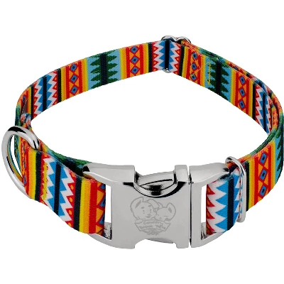 Take a stroll through the summertime pines with Country Brook Petz’ Summer Pines Premium Dog Collar. Gorgeous blues, rich yellows and oranges, and brilliant whites work together in geometric formations to create a fluid pattern of pine trees. Triangles and straight lines run throughout the design and cohesively form an arrangement that offers a summer pine vibe. Printed using our colorfast dye, our collars will not run or bleed. Created from superior hardware and webbing, Country Brook Petz’ Summer Pines Premium Dog Collars will not only provide your pup with a trendy collar, but will give you a sense of ease when using our products.Country Brook Petz’ premium patterned collars are vibrant, comfortable collars made right here in the U.S.A. These collars are constructed using strong polyester webbing, dependable metal side release buckles that feature a brilliant mirror finish, heavy-duty wide-mouthed triglides, and heavy welded D-rings. Our polyester collars are ribbed, soft, and sleek to the touch with a little bit of a sheen. Country Brook makes all their collars after the order has been placed. However, rest assured as your collar will ship within two business days of receiving payment.We want your furbaby to be able to show the world their new collar immediately, so be sure to measure for the right size. You can check this out by using a string, or tape measure, to see where the collar will fit snugly and comfortably on your dog’s neck. These stylish prints work well with both boy and girl puppers.