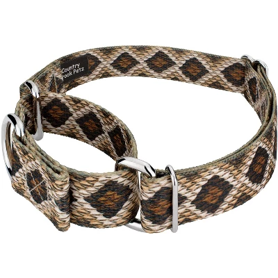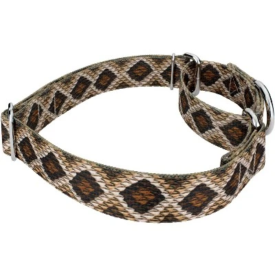 SSSSS.. That’s the sound of our Rattlesnake Martingale Dog Collar. This snake skin pattern is authentic with diamond shapes and earthy tones throughout. Printed using our colorfast dye, our collars will not run or bleed. Created from superior hardware and webbing, Country Brook Petz’ Rattlesnake Martingale Dog Collars will not only provide your pup with a trendy collar, but will give you a sense of ease when using our products.Is your good boy or girl slipping out of their collar? Well, our martingale collars are designed to prevent your pup from pulling out of their collar by tightening around your dog’s neck whenever they try to remove their heads. Once Fido quits pulling, the collar relaxes against their neck. Perfect for training, the twin loop design gives you control over your stroll. The martingale collar is often referred to as a humane choke collar. A no-slip, adjustable-choke collar is an excellent solution for sighthounds who slip out of their collars.The Extra Small, Mini and Micro are still reliable with a 700 lb. tensile strength, even though they may seem delicate.By adjusting the metal slide, you give slack to the loop. Slip it over your dog’s neck and decrease size until you can comfortably slip only a couple of fingers under the collar. The unique limited closure prevents the choke from becoming too tight. We at Country Brook Petz pride ourselves on only using the best hardware and you can rest assured that these collars will withstand whatever your pup brings its way. Our collars have wide-mouthed heavy-duty triglides for easy adjustment and heavy-welded D-rings for strength. Designed to give you back control while your pup is leashed.