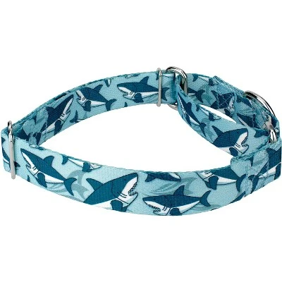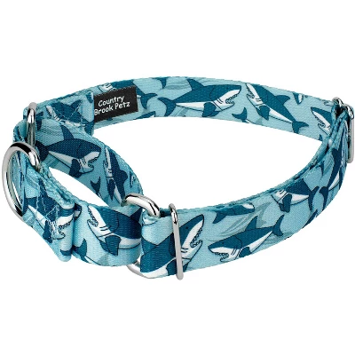 The terrifying jaws of our Sharks Martingale Dog Collar and Leash are here to take its prey. Featuring blueish gray sharks swimming against a rolling oceanic background. When you order this dog collar and leash set, you will receive a martingale collar and a matching leash; collar size of your choice with an accompanying 6 foot leash. Our collar and leash sets are uniquely designed and have a silky smooth polyester loop that slips over your hand, giving you a comfortable grip while walking your pet; box stitching ensures strength for when your pup pulls against their leash.The Extra Small, Mini and Micro are still reliable with a 700 lb. tensile strength, even though they may seem delicate.Our martingale collars are designed to prevent your pup from pulling out of their collar by tightening around your dog’s neck whenever they try to remove their heads. Perfect for training, the twin loop design gives you control over your stroll. By adjusting the metal slide, you give slack to the loop. Slip it over your dog’s neck and decrease size until you can comfortably slip only a couple of fingers under the collar. The unique limited closure prevents the choke from becoming too tight. We at Country Brook Petz pride ourselves on only using the best hardware and you can rest assured that these collars will withstand whatever your pup brings its way. Our collars have wide-mouthed heavy-duty triglides for easy adjustment and heavy-welded D-rings for strength. Designed to give you back control while your pup is leashed.Country Brook Design cannot be held responsible for misuse of this product. It is the responsibility of the purchaser to determine the suitability of the product for their use.