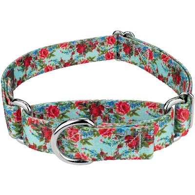 Antique in style, this pattern features Kiss-Me-Nots accentuating gorgeous roses. A beautiful, vintage rose pattern set on a soft blue background captures a sense of romanticism in Country Brook Petz Vintage Roses Martingale Dog Collar! Printed using our colorfast dye, there are no runs or bleeding onto your pupper. Made from superior hardware and webbing, Country Brook Petz’ Vintage Roses Martingale Dog Collar will provide you with not only trendy pup attire, but a sense of ease when using our products.Is your good boy or girl slipping out of their collar? Well, our martingale collars are designed to prevent your pup from pulling out of their collar by tightening around your dog’s neck whenever they try to remove their heads. Once Fido quits pulling, the collar relaxes against their neck. Perfect for training, the twin loop design gives you control over your stroll. The martingale collar is often referred to as a humane choke collar. A no-slip, adjustable-choke collar is an excellent solution for sighthounds who slip out of their collars.The Extra Small, Mini and Micro are still reliable with a 700 lb. tensile strength, even though they may seem delicate.By adjusting the metal slide, you give slack to the loop. Slip it over your dog’s neck and decrease size until you can comfortably slip only a couple of fingers under the collar. The unique limited closure prevents the choke from becoming too tight. We at Country Brook Petz pride ourselves on only using the best hardware and you can rest assured that these collars will withstand whatever your pup brings its way. Our collars have wide-mouthed heavy-duty triglides for easy adjustment and heavy-welded D-rings for your dog’s safety. Designed to make your dog safer on a leash, this training collar gives you back control.